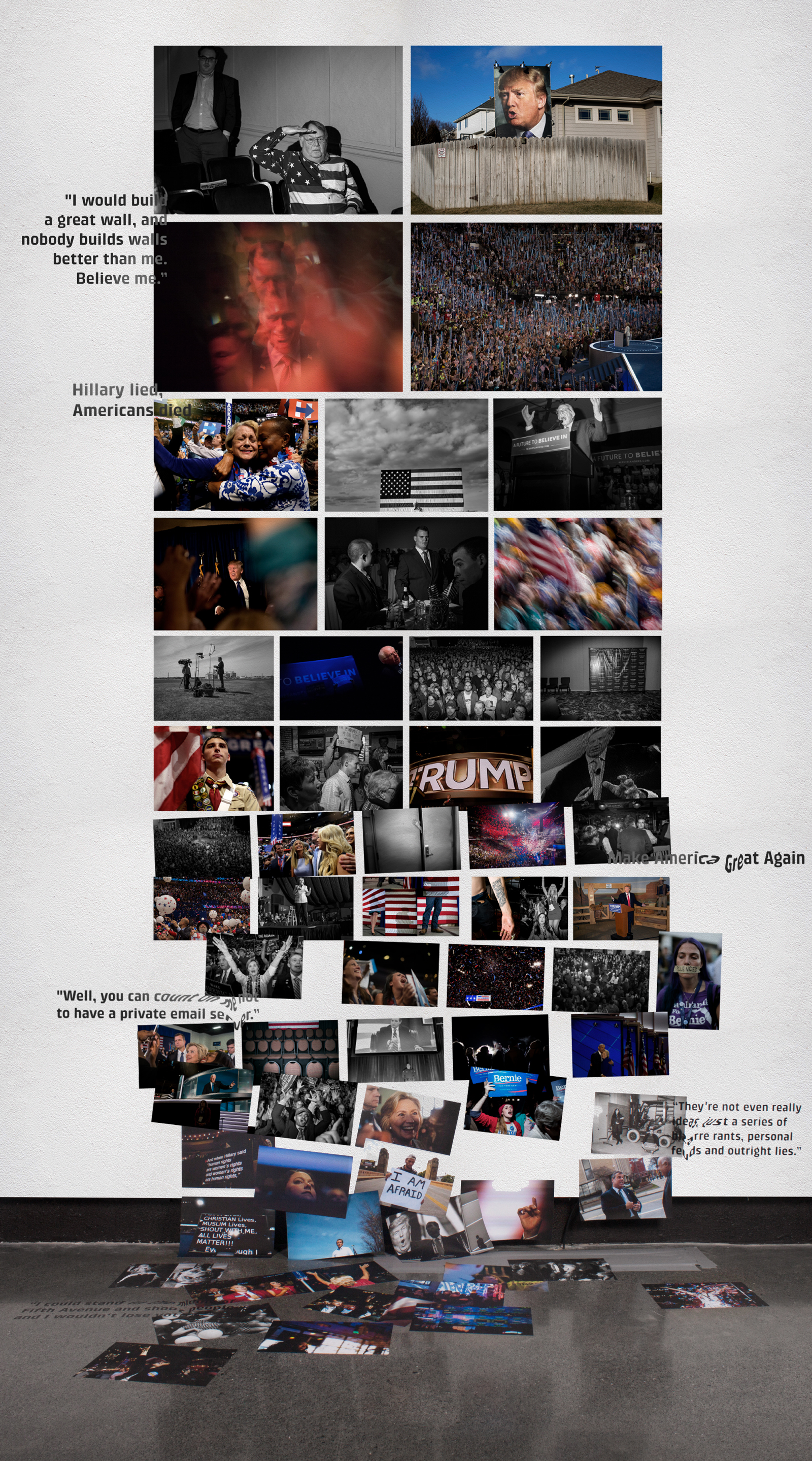SOLUTION: Capturing the frenetic energy and growing disintegration of the election along a grid similar to the scrolling layout of social media platforms. The increased deterioration of the grid lead to photos and vinyl quotes spilling onto the floor as the photos were placed in the gallery in real time.